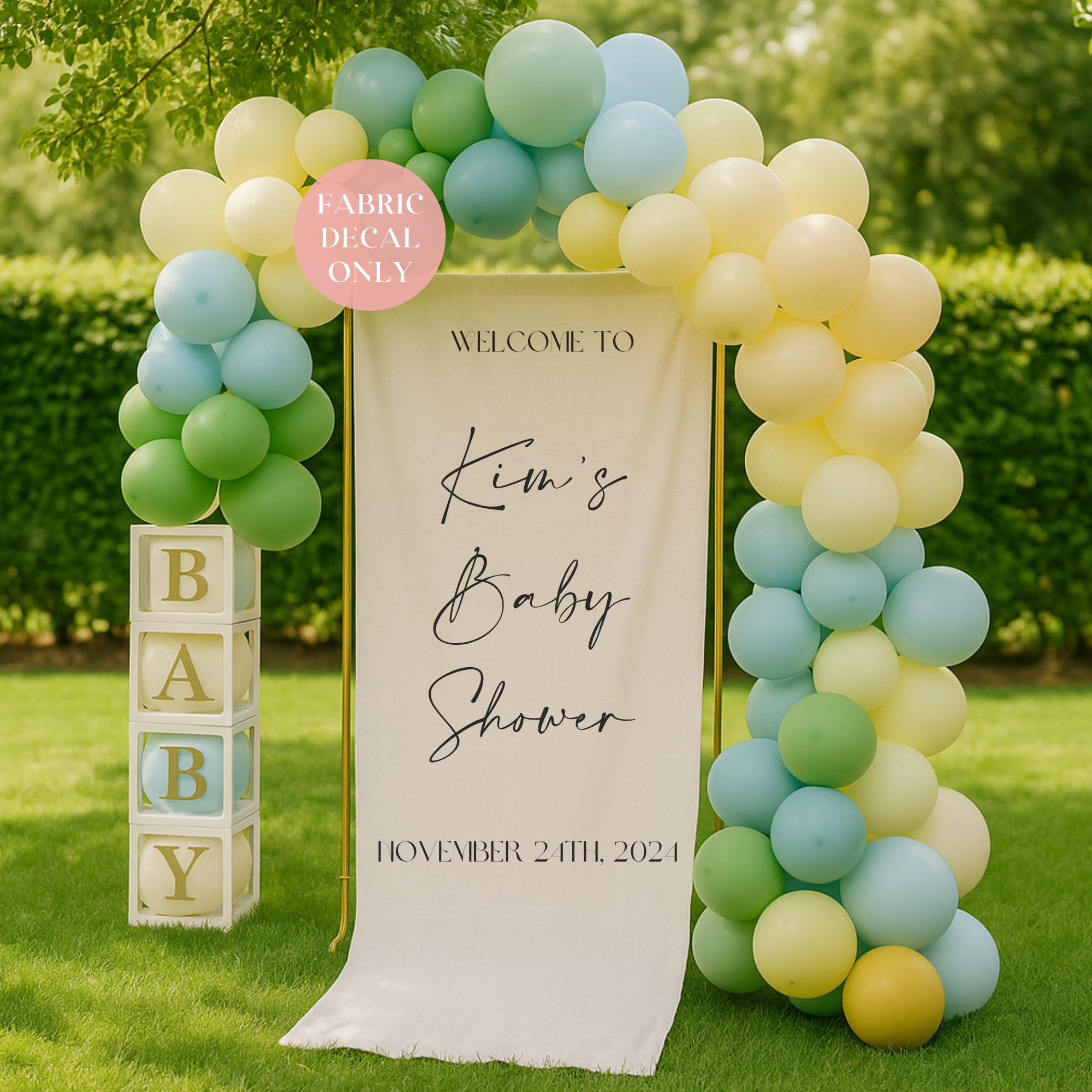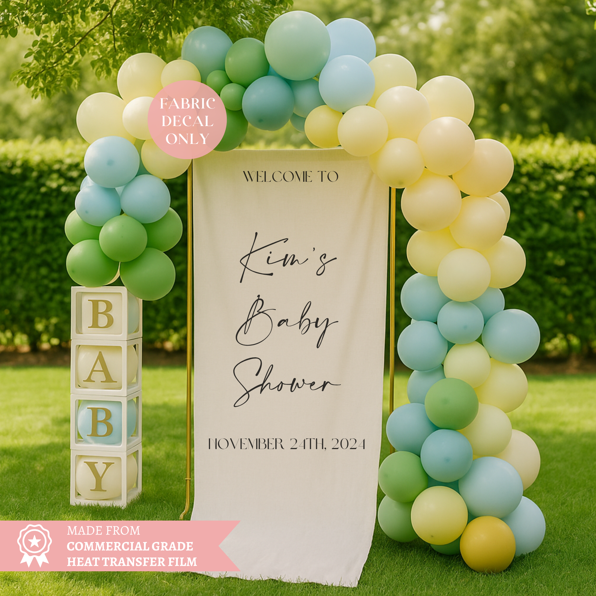 Create a beautiful and personalised welcome moment with this heat transfer vinyl decal – designed for use on linen or fabric banners at baby showers. Customised with your chosen name and date, it’s ideal for DIY event signage with a modern, minimal aesthetic. Made from commercial-grade HTV for clean, long-lasting results.