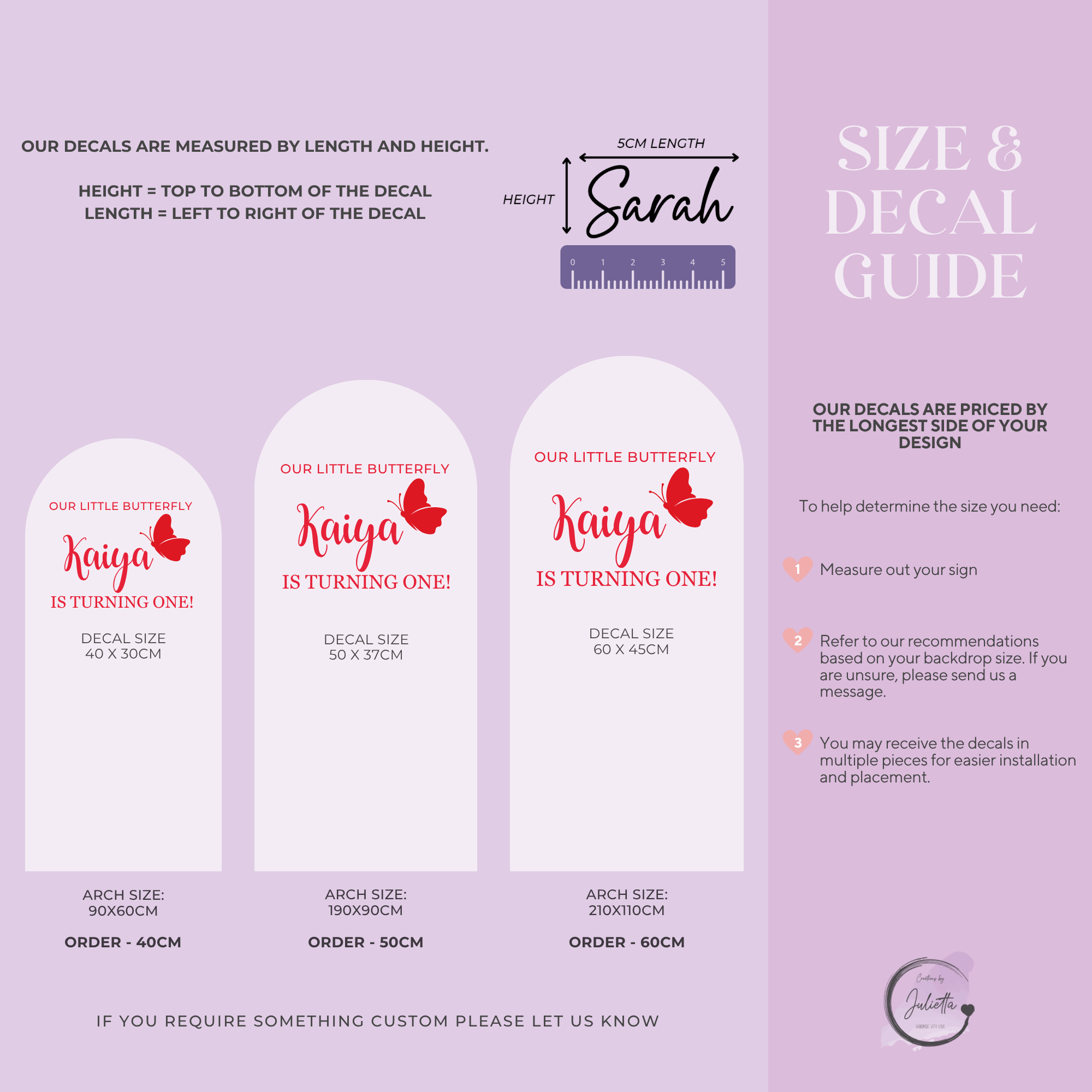 Celebrate your little butterfly’s first birthday with this stunning vinyl decal, personalised with your child’s name. Designed to suit arch backdrops or foam boards, this red and blush pink design is perfect for garden parties. Made from premium outdoor sign vinyl for a seamless, professional finish.