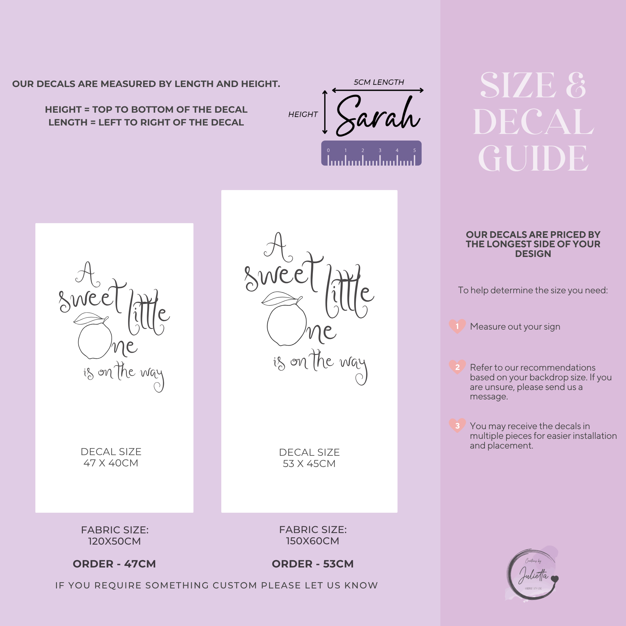 Celebrate the joy of a little one on the way with this gender-neutral baby shower fabric decal. Featuring the phrase “A Sweet Little One Is On The Way”, this design is cut in premium heat transfer vinyl, perfect for linen or cotton backdrop signs. Soft yellow tones and whimsical script make it ideal for spring, lemon, or neutral-themed celebrations.
